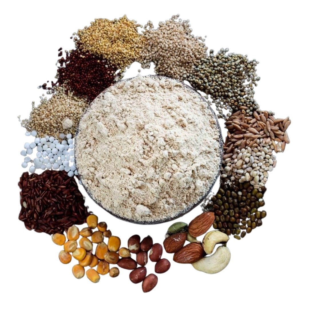 Power-packed Health Mix (சத்து மா‌வு) made with 15+ natural grains, nuts, and pulses. Ideal for babies, kids, adults, and seniors. No added sugar or preservatives. 100% homemade and nutritious.